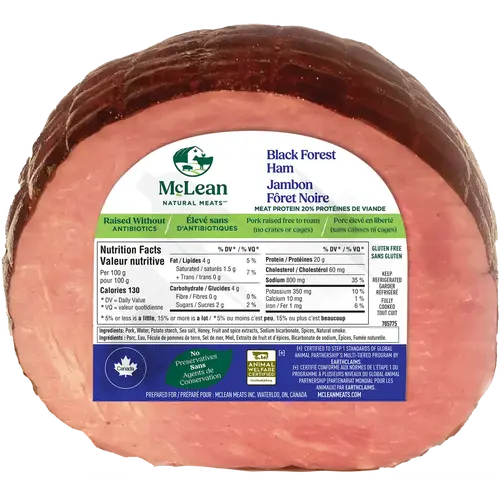 Black Forest Ham Products > Deli Counter > Black Forest Ham Product Features Raised Without Antibiotics No Preservatives Raised Free to Roam Gluten Free No Dairy or Soy Description Our Black Forest ham is made from pork raised without antibiotics and free to roam. It’s naturally smoked and seasoned for a rich, savoury flavour. Ingredients Pork, Water, Potato starch, Sea salt, Honey, Fruit & spice extracts, Sodium bicarbonate, Spices, Natural smoke. Nutrition Facts Per 100 g Calories 130 Nutritional facts 1 of 2 Amount % DV* Daily Value Fat 4 g 5 % Saturated 1.5 g 7 % +Trans 0 g Carbohydrate 4 g Fibre 0 g 0 % Sugars 2 g 2 % >Nutritional facts 2 of 2 Amount % DV* Daily Value Protein 20 g Cholesterol 60 mg Sodium 800 mg 35 % Potassium 350 mg 10 % Calcium 10 mg 1 % Iron 1 mg 6 % *DV = Daily Value 5% or less is a little, 15% or more is a lot Refer to the package for the most accurate and up to date information.