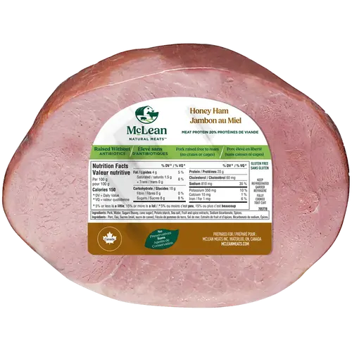 Honey Ham Products > Deli Counter > Honey Ham Product Features Raised Without Antibiotics No Preservatives Raised Free to Roam Gluten Free No Dairy or Soy Description Prepared from pork raised without antibiotics and free to roam, this honey ham offers gentle sweetness with balanced savoury notes. Ideal for slicing and use across sandwiches and prepared menu items. Ingredients Pork, Water, Sugars (honey, cane sugar), Potato starch, Sea salt, Fruit and spice extracts, Sodium bicarbonate, Spices. Nutrition Facts Per 100 g Calories 150 Nutritional facts 1 of 2 Amount % DV* Daily Value Fat 4 g 5 % Saturated 1.5 g 8 % +Trans 0 g Carbohydrate 10 g Fibre 0 g 0 % Sugars 8 g 8 % >Nutritional facts 2 of 2 Amount % DV* Daily Value Protein 20 g Cholesterol 60 mg Sodium 810 mg 35 % Potassium 350 mg 10 % Calcium 10 mg 1 % Iron 1 mg 6 % *DV = Daily Value 5% or less is a little, 15% or more is a lot Refer to the package for the most accurate and up to date information.