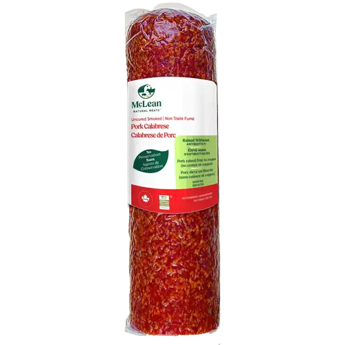 Smoked Pork Calabrese Products > Deli Counter > Smoked Pork Calabrese Product Features Raised Without Antibiotics No Preservatives Raised Free to Roam Gluten Free No Dairy or Soy Description Pepper, paprika and Calabrian chilies give this uncured salami it’s bold flavour with just a touch of heat. Ingredients Pork, Sea salt, Spices, Honey, Fruit and spice extracts, Lactic acid starter culture, Natural smoke. Nutrition Facts Per 100 g Calories 400 Nutritional facts 1 of 2 Amount % DV* Daily Value Fat 32 g 43 % Saturated 15 g 75 % +Trans 0 g Carbohydrate 2 g Fibre 0 g 0 % Sugars 1 g 1 % >Nutritional facts 2 of 2 Amount % DV* Daily Value Protein 26 g Cholesterol 90 mg Sodium 1480 mg 64 % Potassium 400 mg 12 % Calcium 10 mg 1 % Iron 1 mg 6 % *DV = Daily Value 5% or less is a little, 15% or more is a lot Refer to the package for the most accurate and up to date information.