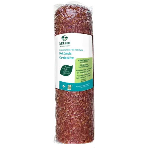 Smoked Pork Cervelat Products > Deli Counter > Smoked Pork Cervelat Product Features Raised Without Antibiotics No Preservatives Raised Free to Roam Gluten Free No Dairy or Soy Description A mild uncured salami seasoned with a blend of organic pepper, and a pinch of cayenne. It’s a great choice for your next charcuterie board or sandwich. Ingredients Pork, Sea salt, Honey, Fruit and spice extracts, Spices, Lactic acid starter culture, Natural smoke. Nutrition Facts Per 100 g Calories 400 Nutritional facts 1 of 2 Amount % DV* Daily Value Fat 32 g 43 % Saturated 15 g 76 % +Trans 0 g Carbohydrate 1 g Fibre 0 g 0 % Sugars 1 g 1 % >Nutritional facts 2 of 2 Amount % DV* Daily Value Protein 26 g Cholesterol 90 mg Sodium 1490 mg 65 % Potassium 350 mg 10 % Calcium 10 mg 1 % Iron 0 mg 5 % *DV = Daily Value 5% or less is a little, 15% or more is a lot Refer to the package for the most accurate and up to date information.