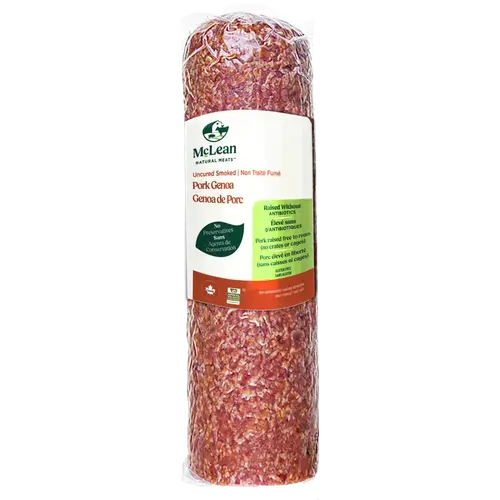 Smoked Pork Genoa Products > Deli Counter > Smoked Pork Genoa Product Features Raised Without Antibiotics No Preservatives Raised Free to Roam Gluten Free No Dairy or Soy Description A blend of black pepper and garlic gives our uncured genoa salami it’s signature taste. It’s a great choice for your next charcuterie board or sandwich. Ingredients Pork, Sea salt, Cane sugar, Black pepper, Fruit and spice extracts, Garlic, Lactic acid starter culture, Natural smoke. Nutrition Facts Per 100 g Calories 440 Nutritional facts 1 of 2 Amount % DV* Daily Value Fat 36 g 48 % Saturated 14 g 72 % +Trans 0 g Carbohydrate 2 g Fibre 0 g 0 % Sugars 1 g 1 % >Nutritional facts 2 of 2 Amount % DV* Daily Value Protein 27 g Cholesterol 100 mg Sodium 1750 mg 76 % Potassium 450 mg 13 % Calcium 10 mg 1 % Iron 1 mg 8 % *DV = Daily Value 5% or less is a little, 15% or more is a lot Refer to the package for the most accurate and up to date information.