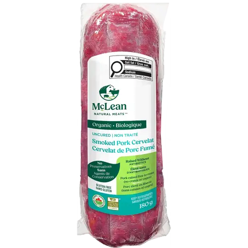 Organic Smoked Pork Cervelat 180 g Products > Deli Specialty > Organic Smoked Pork Cervelat Product Features Raised Without Antibiotics No Preservatives Raised Free to Roam Gluten Free No Dairy or Soy Description A mild uncured salami seasoned with a blend of organic pepper, and a pinch of cayenne. It’s a great choice for your next charcuterie board or sandwich. Ingredients Organic pork, Sea salt, Sugars (Organic honey), Fruit and spice extracts, Organic spices (organic white pepper, organic black pepper, organic cayenne pepper), Lactic acid starter culture, Natural smoke. Nutrition Facts Per 100 g Calories 400 Nutritional facts 1 of 2 Amount % DV* Daily Value Fat 32 g 43 % Saturated 15 g 76 % +Trans 0 g Carbohydrate 1 g Fibre 0 g 0 % Sugars 1 g 1 % >Nutritional facts 2 of 2 Amount % DV* Daily Value Protein 26 g Cholesterol 90 mg Sodium 1490 mg 65 % Potassium 350 mg 10 % Calcium 10 mg 1 % Iron 0 mg 5 % *DV = Daily Value 5% or less is a little, 15% or more is a lot Refer to the package for the most accurate and up to date information.