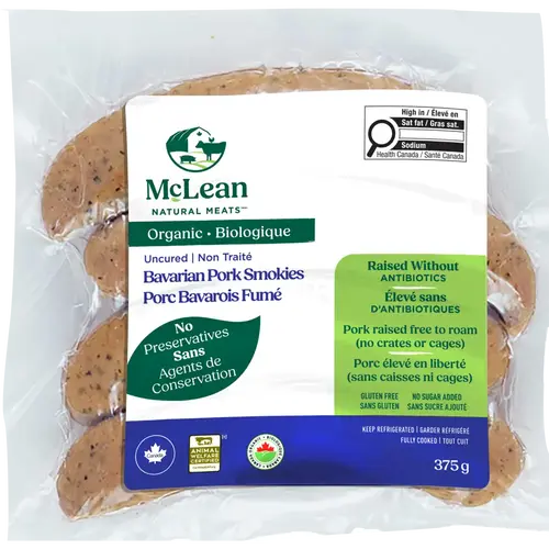 Organic Bavarian Pork Smokies 375 g Products > Dinner Ham & Smokies > Organic Bavarian Pork Smokies Product Features Raised Without Antibiotics No Preservatives Raised Free to Roam No Sugar Added Gluten Free No Dairy or Soy Description Savour the rich, smoky taste of our Bavarian Pork Smokies. They’re perfect for grilling, quick lunches or dinners, and deliver comfort in every bite. Ingredients Organic pork, Water, Sea salt, Organic potato starch, Organic spices, Organic garlic, Sodium bicarbonate, Organic herbs, Natural smoke. Nutrition Facts Per 1 smokie (94 g) Calories 190 Nutritional facts 1 of 2 Amount % DV* Daily Value Fat 13 g 18 % Saturated 6 g 32 % +Trans 0 g Carbohydrate 2 g Fibre 0 g 0 % Sugars 0 g 0 % >Nutritional facts 2 of 2 Amount % DV* Daily Value Protein 16 g Cholesterol 55 mg Sodium 760 mg 33 % Potassium 300 mg 9 % Calcium 10 mg 1 % Iron 0 mg 6 % *DV = Daily Value 5% or less is a little, 15% or more is a lot Refer to the package for the most accurate and up to date information.