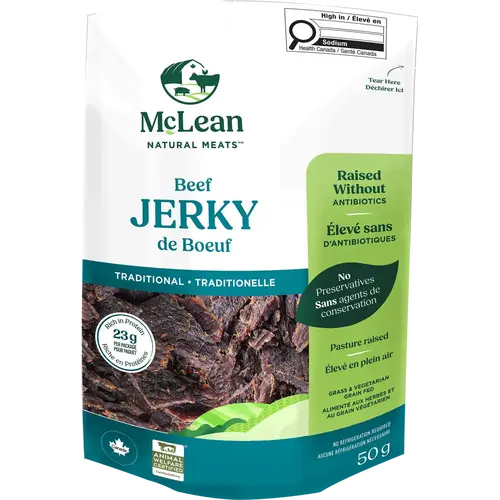 Traditional Beef Jerky 50 g Products > Snacks > Traditional Beef Jerky Product Features Raised Without Antibiotics No Preservatives Pasture Raised Grass and Vegetarian Grain Fed Gluten Free No Dairy or Soy Description Tender yet satisfyingly chewy, this traditional beef jerky delivers a classic, savoury bite. 20g of protein and made from beef raised without antibiotics, our jerky delivers on both flavour and function. Ingredients Beef, Sugars [sugar, maltodextrin, dextrose, dry molasses (molasses, maltodextrin)], Sea salt, Apple cider vinegar, Spices, Natural flavours (contains yeast extract), Garlic, Caramel colour, Green tea extract, Ascorbic acid, Spice extracts, Smoke. Nutrition Facts Per package (50 g) Calories 120 Nutritional facts 1 of 2 Amount % DV* Daily Value Fat 1.5 g 2 % Saturated 0.5 g 3 % +Trans 0.1 g Carbohydrate 0 g Fibre 0 g 0 % Sugars 1 g 1 % >Nutritional facts 2 of 2 Amount % DV* Daily Value Protein 23 g Cholesterol 50 mg Sodium 570 mg 25 % Potassium 250 mg 7 % Calcium 10 mg 1 % Iron 1 mg 8 % *DV = Daily Value 5% or less is a little, 15% or more is a lot Refer to the package for the most accurate and up to date information.